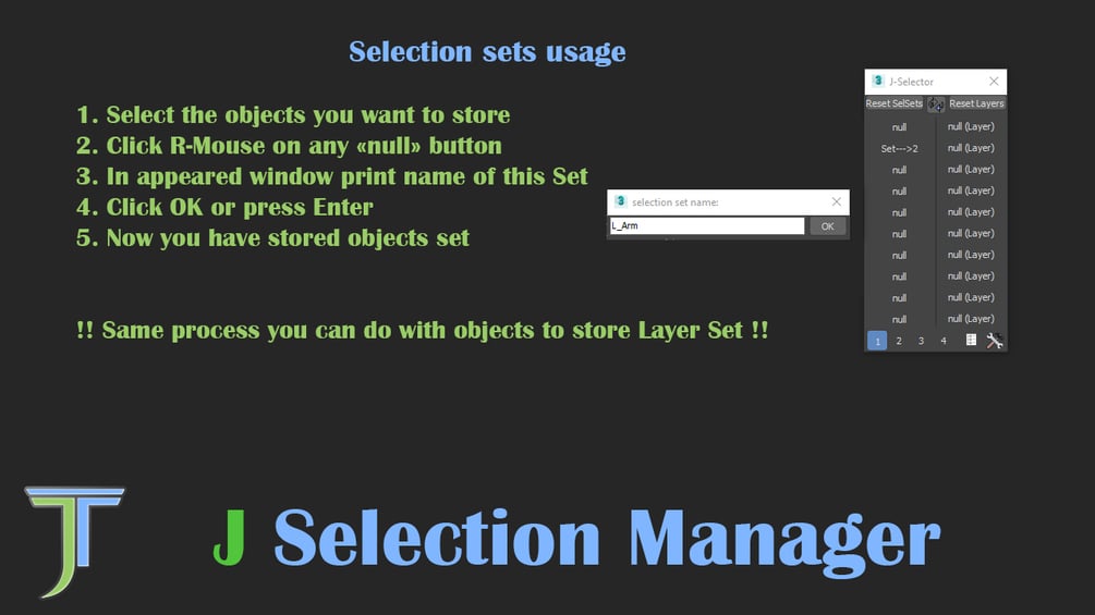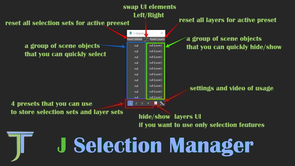 Script creates "Properties" layer in scene and helper named "j_selectionSets_hlp" to store all settings. Do not delete them, that will cause script data lost.