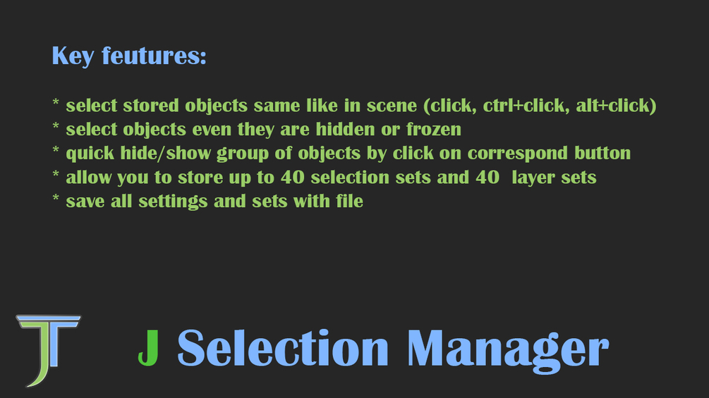 JSelectionManager designed for speed up your work by optimizing the selection of objects and hiding/showing groups of objects