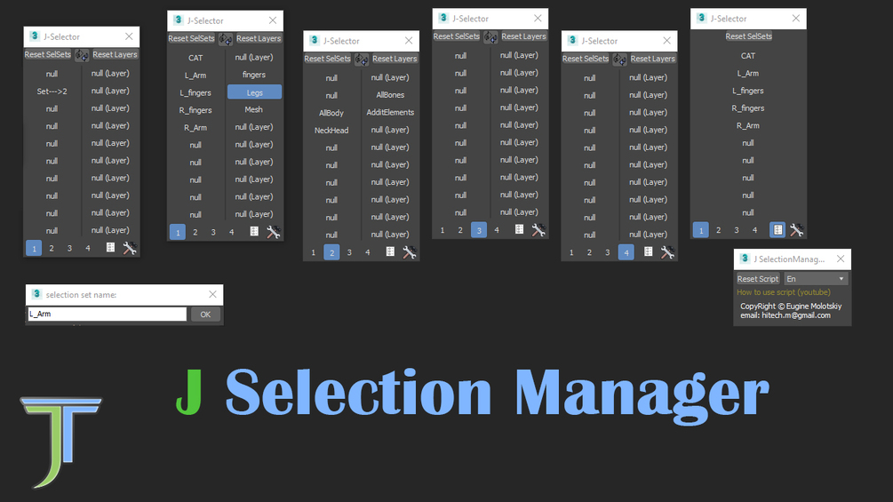Script creates "Properties" layer in scene and helper named "j_selectionSets_hlp" to store all settings. Do not delete them, that will cause script data lost.